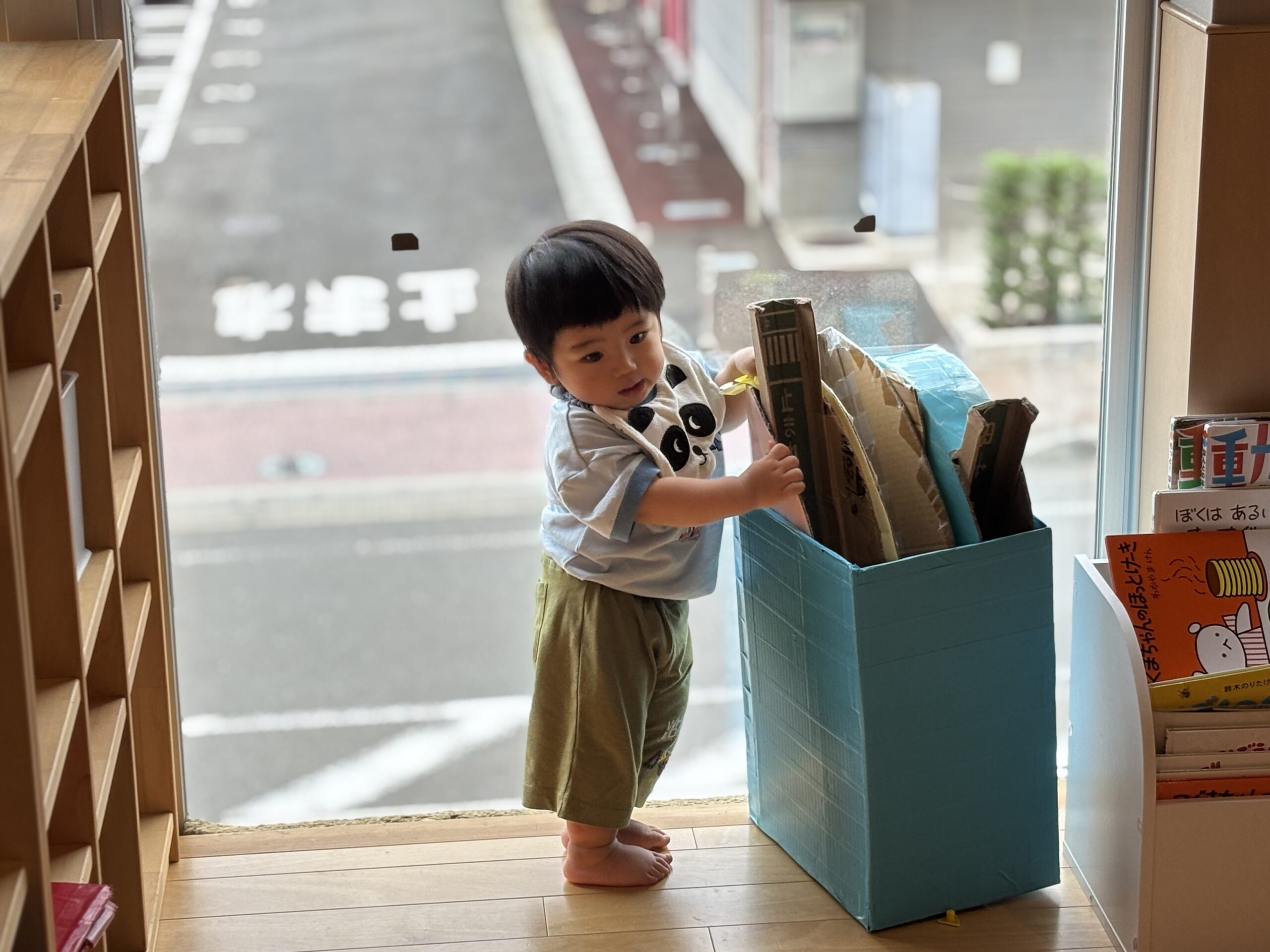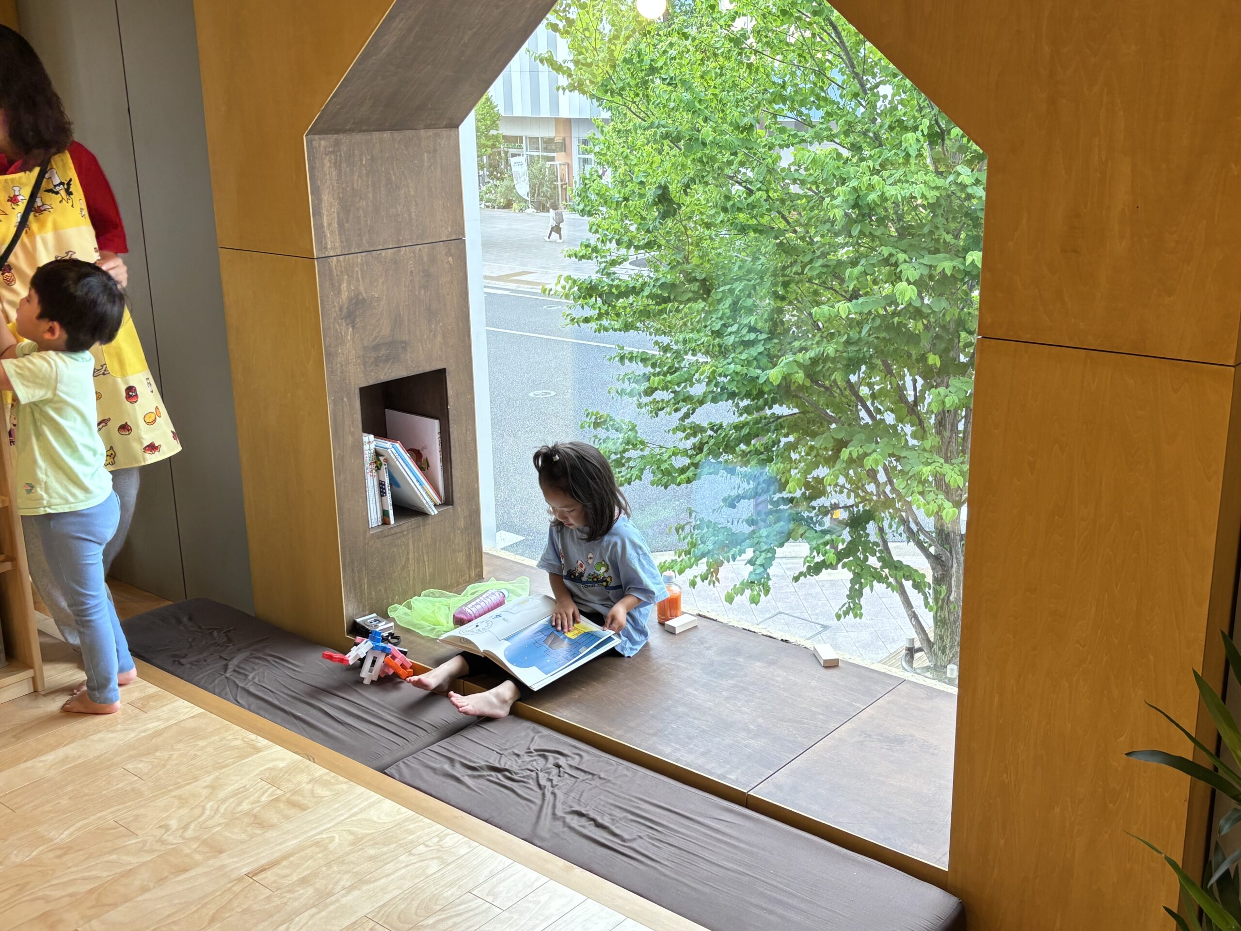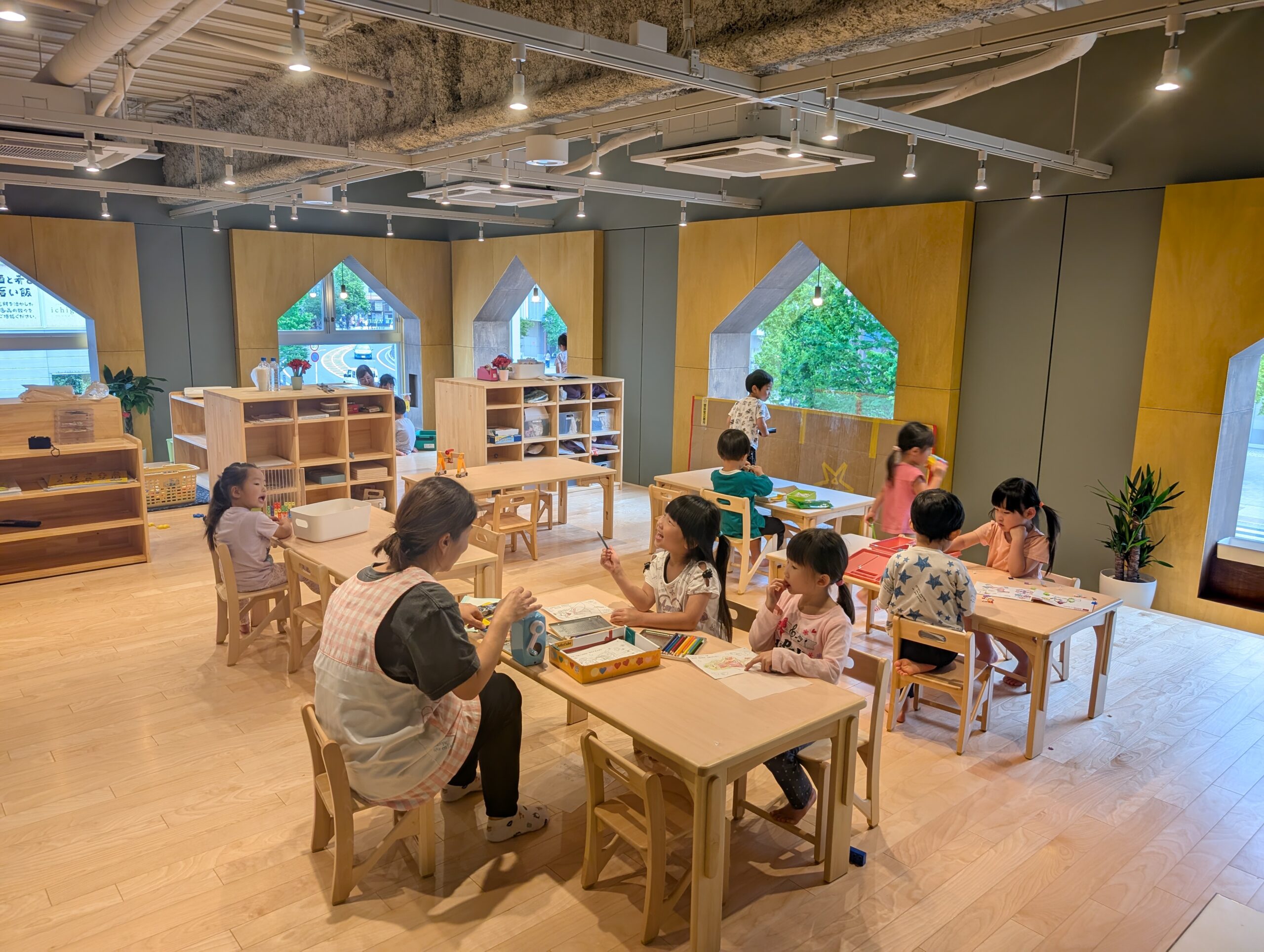 大きな窓が特徴のビルの2階にある園舎は、”小さな冒険者の原体験ラボ”をコンセプトに、子どもたちの五感をはぐくむために、無垢材や自然に近いものを多く使ったつくりになっています。